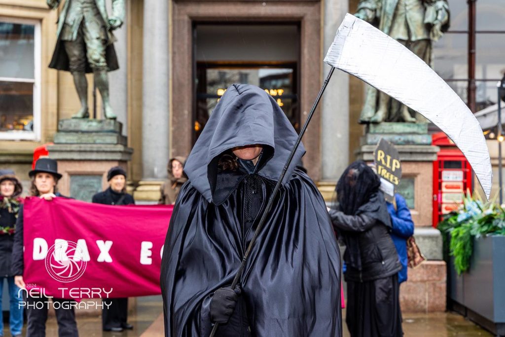 - February – supported Drax campaigner Diana Warner at her Leeds Crown Court trial and held a “Funeral for Trees” action in Leeds. Plus we supported protests against the felling of the Tittybottle Oak in Otley.